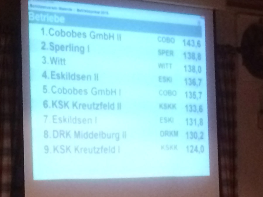Die Firma Cobobes hat mit 2 Teams zu je 3 Personen am Betriebsmannschaftsschießen der Malenter Sportschützen teilgenommen. Dabei erreichte das Cobobes Team 2 den ersten Platz mit 143,6 Ringen. Die Geschäftsführung Herr Manfred, Stefan und Sebastian Dose sind sehr stolz auf dieses beachtliche Ergebnis. Aber auch die anderen Cobobes Teams erzielten tolle Ergebnisse: 5. Platz für Cobobes Team 1. Hervorzuheben sind noch die Einzelergebnisse von Herrn Norbert Benner mit dem 4. Platz und Herrn Martin Syring mit dem 5. Platz bei den Betrieben. Die Firme Cobobes freut sich, dass solche Veranstaltung zur Teambildung heutzutage noch durchgeführt werden und bedankt sich bei den Malenter Sportschützen für die Organisation.
