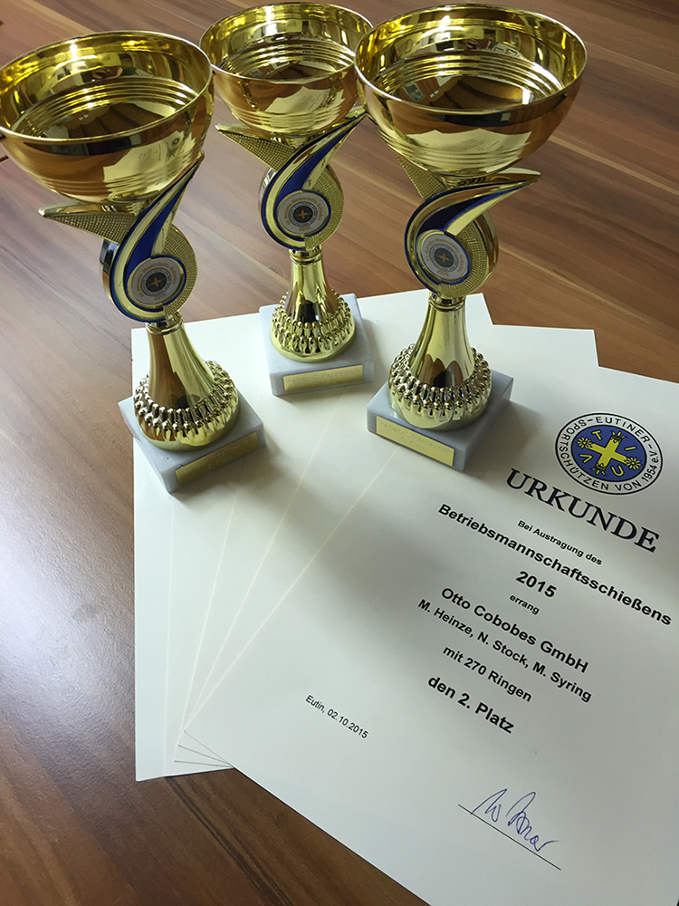 Die Firma Cobobes hat mit 4 Teams zu je 3 Personen an der 57. Auflage des Betriebsmannschaftsschießen der Eutiner Sportschützen teilgenommen. Dabei erreichte das Cobobes Team 1 einen sehr guten zweiten Platz mit 270 Ringen hinter dem LMK Team mit 271 Ringen bei den Herren I. Die Geschäftsführung Herr Manfred, Stefan und Sebastian Dose sind sehr stolz auf dieses beachtliche Ergebnis. Aber auch die anderen Cobobes Teams erzielten tolle Ergebnisse: 2. Platz für Cobobes Team 2, 3. Platz für Cobobes Team 3 und 5. Platz für Cobobes Team 4 bei den Herren II. Hervorzuheben sind noch die Einzelergebnisse von Frau Daniela Schwarz mit dem 7. Platz bei den Frauen und Herrn Martin Syring mit dem 5. Platz bei den Herren. Die Firme Cobobes bedankt sich bei den Eutiner Sportschützen für die gelungene Veranstaltung und freut sich, dass solche Veranstaltungen zur Stärkung des Teamgeistes durchgeführt werden.