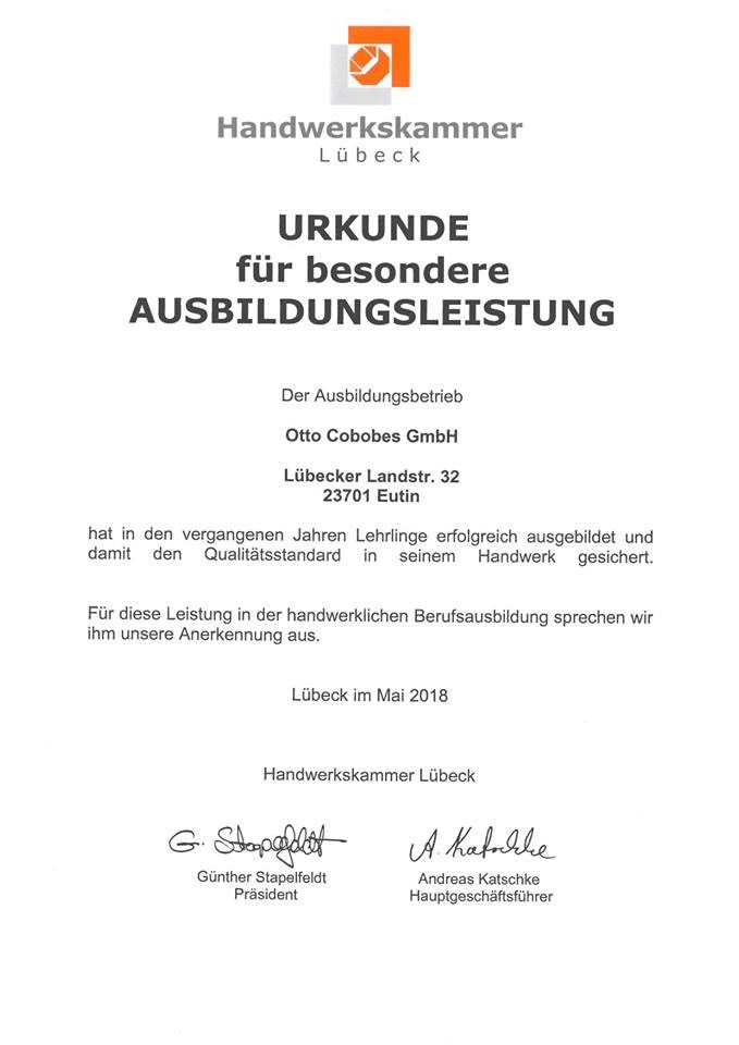 Mit Stolz dürfen wir verkünden, dass wir von der Handwerkskammer Lübeck für eine besondere Ausbildungsleistung zertifiziert worden sind. Wir fördern und fordern unsere Auszubildenden in besonderem Maße, denn die besten Kollegen findet man meist in den eigenen Reihen. Mit viel Freude und Einsatz setzen wir alles daran, den Nachwuchs von heute zu langfristigen Kollegen von morgen zu machen.