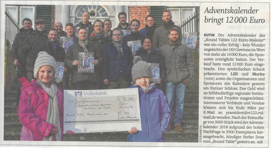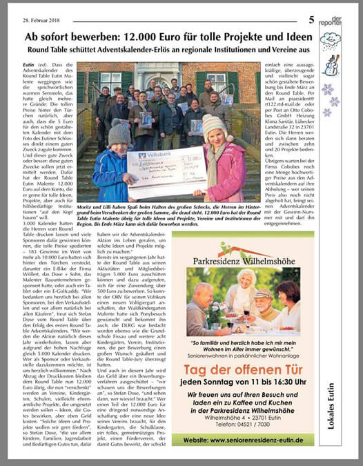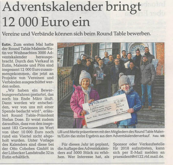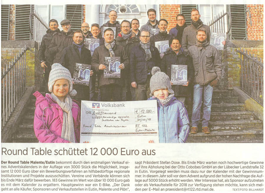 Anbei eine tolle Aktion des Round Table 122 Eutin - Malente. Es werden 12.000 Euro für gemeinnützige regionale Projekte ausgeschüttet, das Bewerbungsverfahren läuft ab sofort bis Ende März 2018.