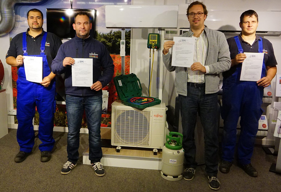 Vier Mitarbeiter der Firma Cobobes haben erfolgreich die Sachkunde für Tätigkeiten an Wärmepumpen und Klimaanlagen abgelegt